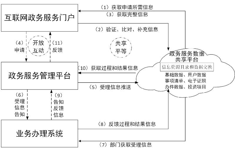 ——政务服务管理平台:是对所有政务服务事项运行管理、监督考核的工作平台,主要把来自互联网政务服务门户的申请信息推送至政务服务数据共享平台,同步告知业务办理系统;同时从政务服务数据共享平台获取并向互联网政务服务门户推送过程、结果信息。此外,借助政务服务管理平台,考核业务部门办理质量和效率。