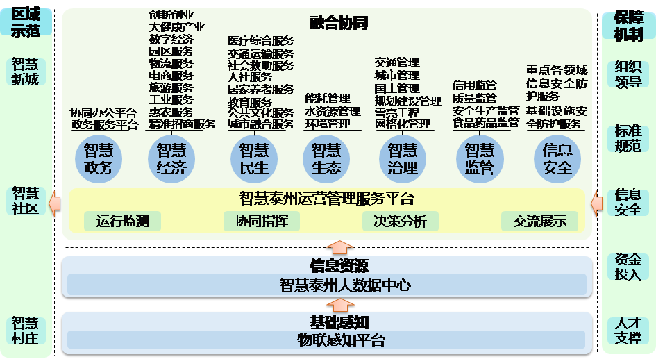 3.政府引导,市场运作。发挥政府规范标准、统筹协调等方面的引导作用,发挥市场在资源配置中的决定性作用,鼓励社会资本参与投资建设和运营,形成政府、企业、社会合力推进的智慧泰州建设模式。